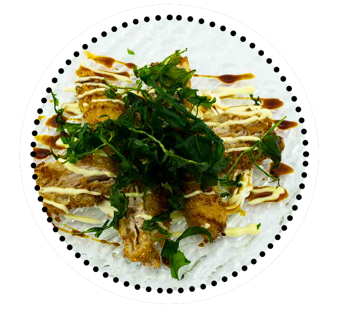 Nigiri di tonno scottato, cipolla fritta, salsa bianca e salsa teriyaki.