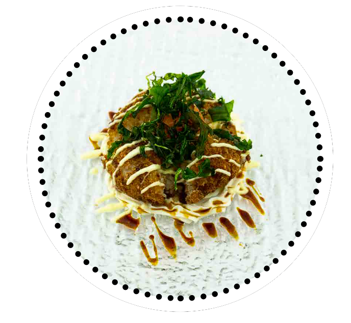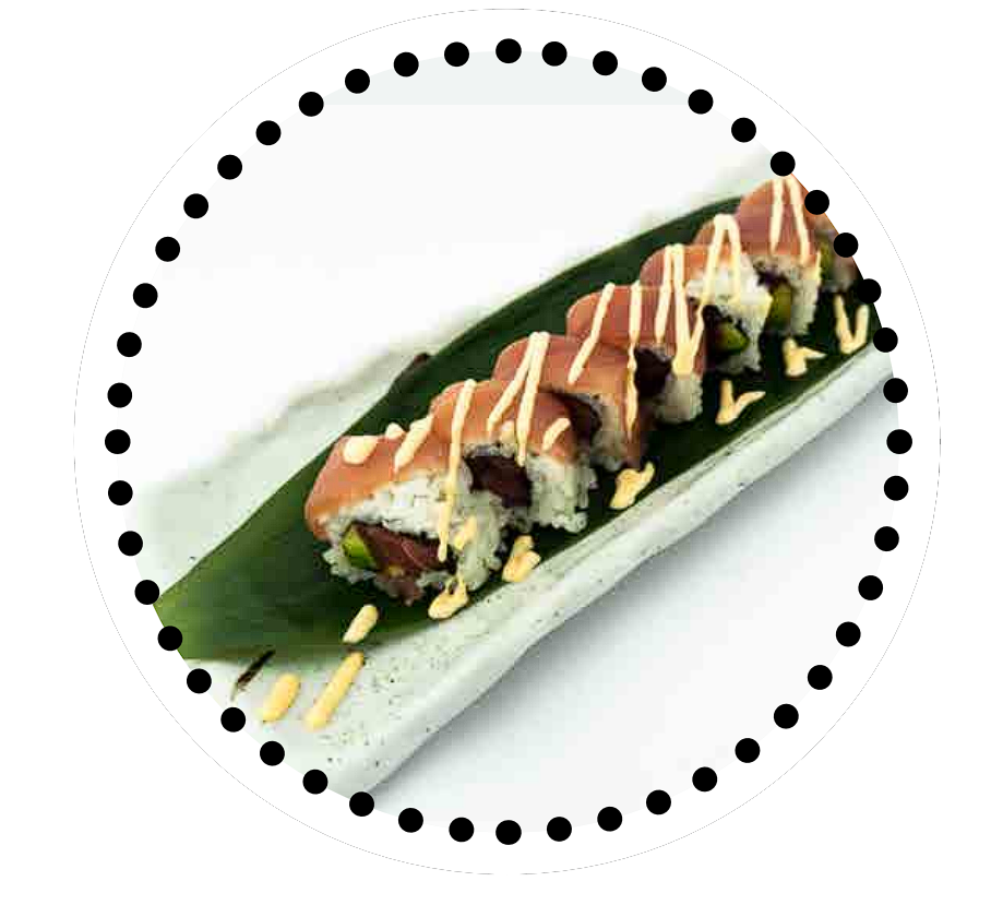Nigiri di salmone scottato, cipolla fritta, salsa bianca e salsa teriyaki.