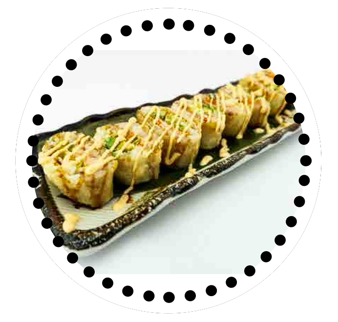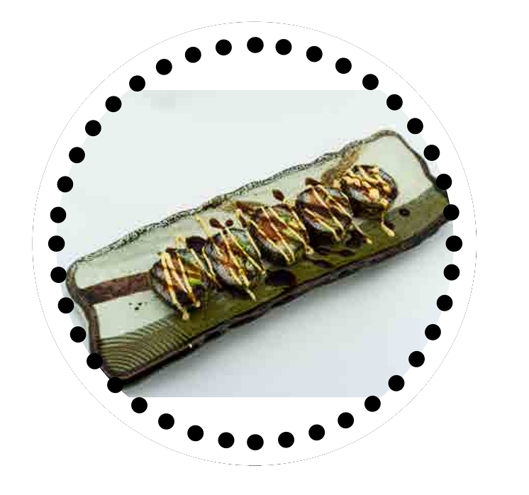 Nigiri di branzino scottato, cipolla fritta, salsa bianca e salsa teriyaki.